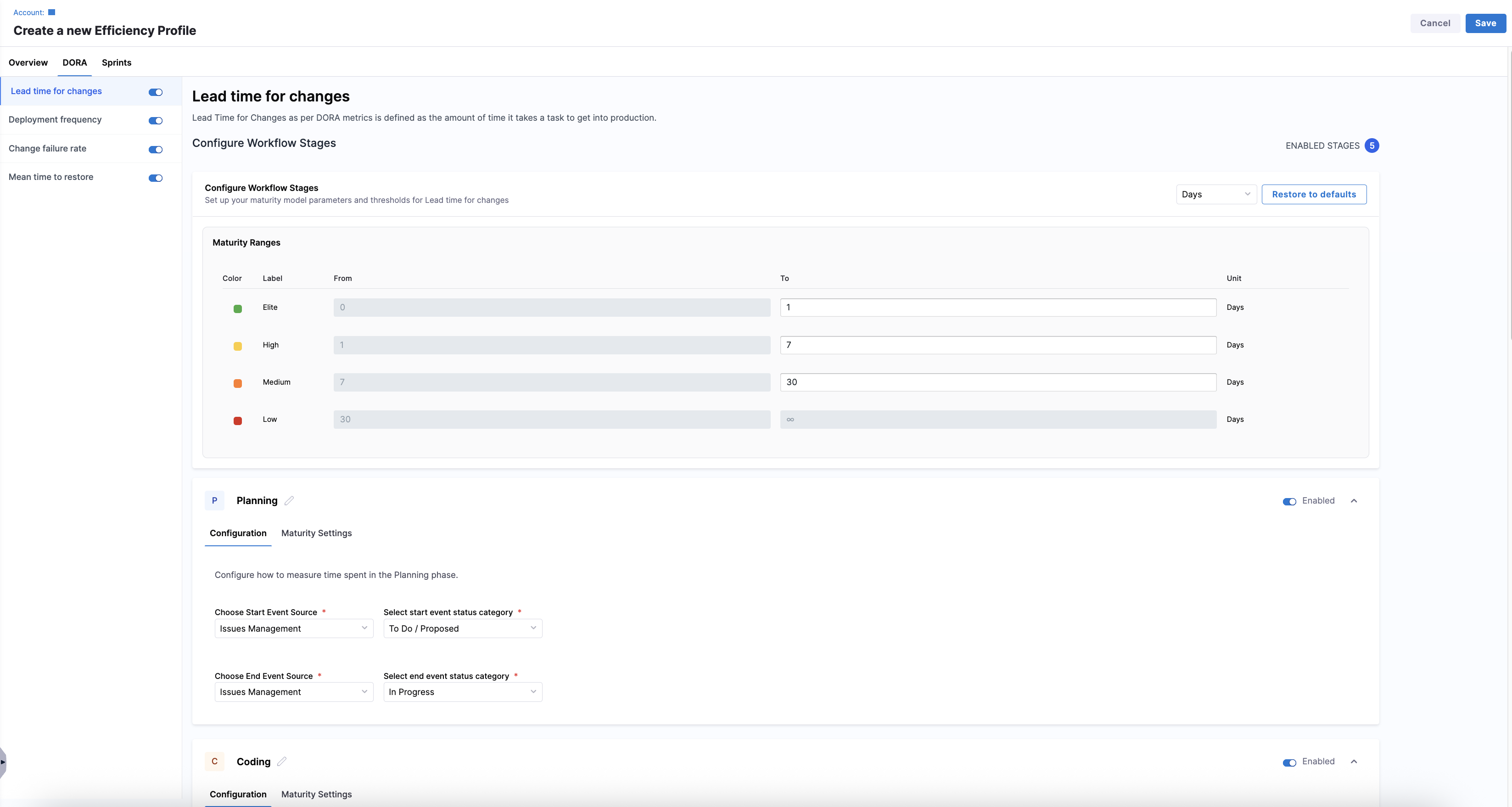 In addition, maturity thresholds for Deployment Frequency, Change Failure Rate, and Mean Time to Restore (MTTR) can be configured directly within their respective sections on the DORA tab in an Efficiency Profile.