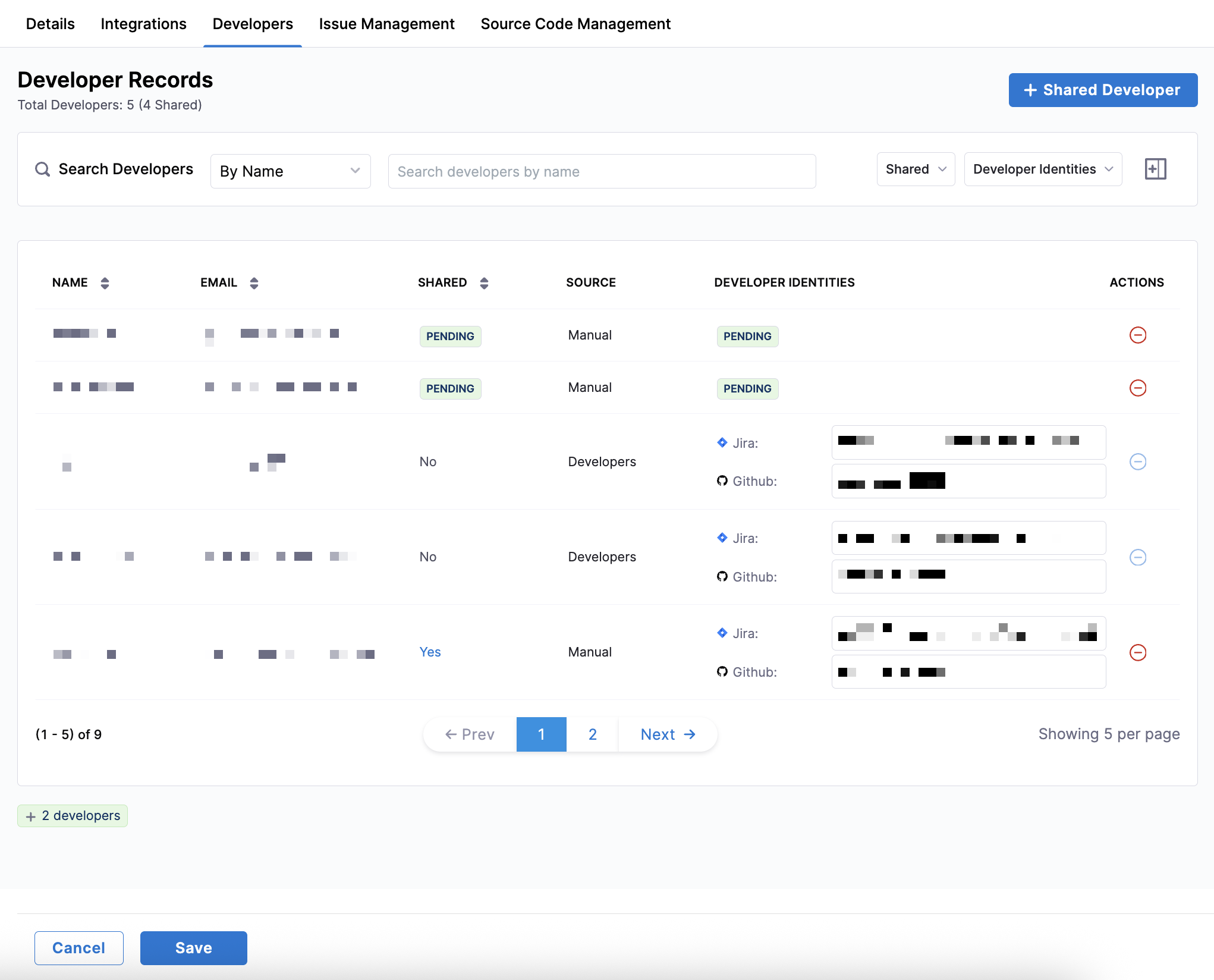 The Developer Records table displays shared developers and distinguish those inherited from the Org Tree (Shared: No) from developers that were manually added to a team (Shared: Yes). The table also includes each developer's source, whether they were discovered through API/CSV ingestion or added through the UI.
